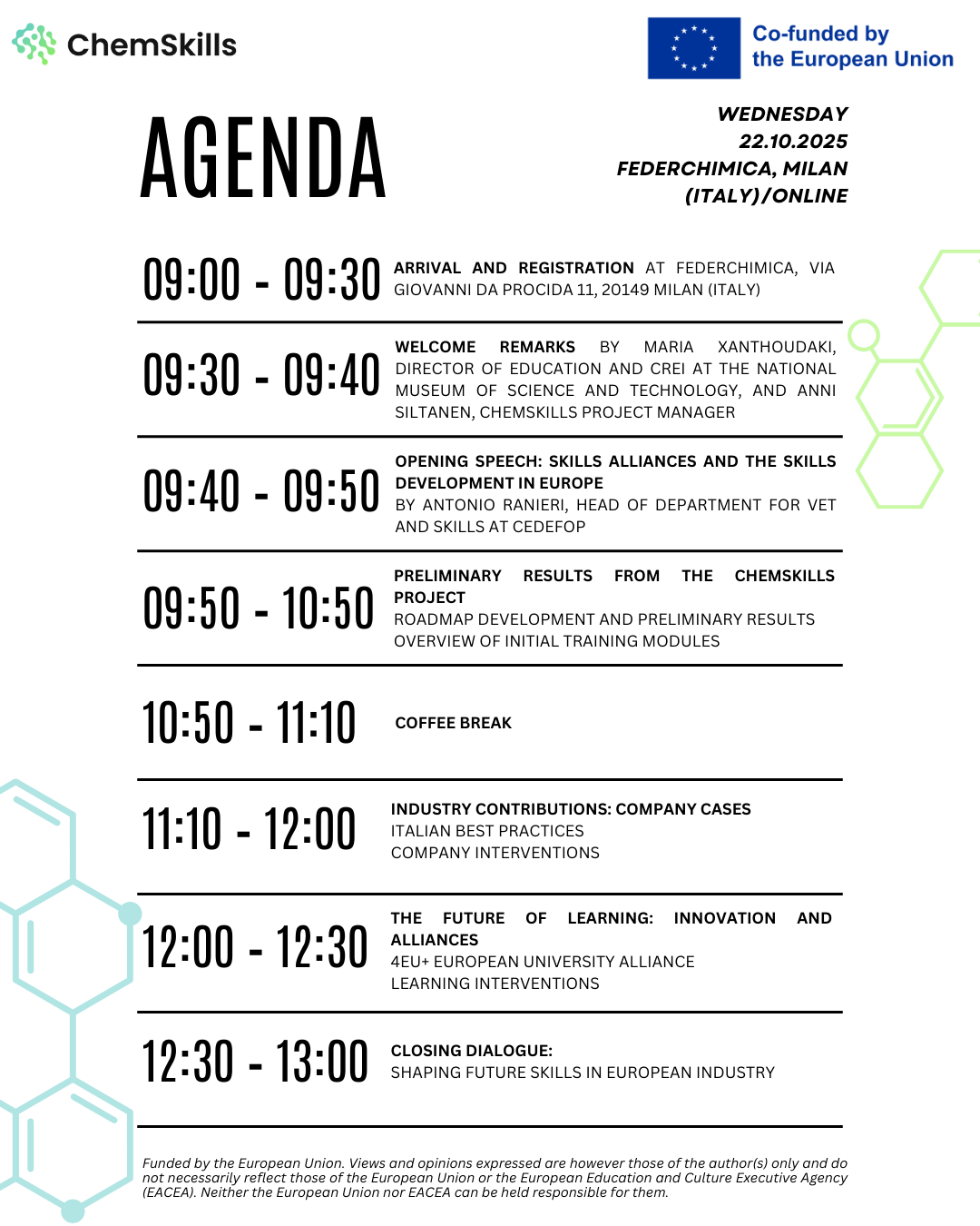 On Wednesday 22.10., Federchimica hosted a conference on future skills needed for the chemical industry green and digital transition. The conference is part of the project ChemSkills. Federchimica is one of the driving forces behind the project, which is funded under the Erasmus+ budget line.
